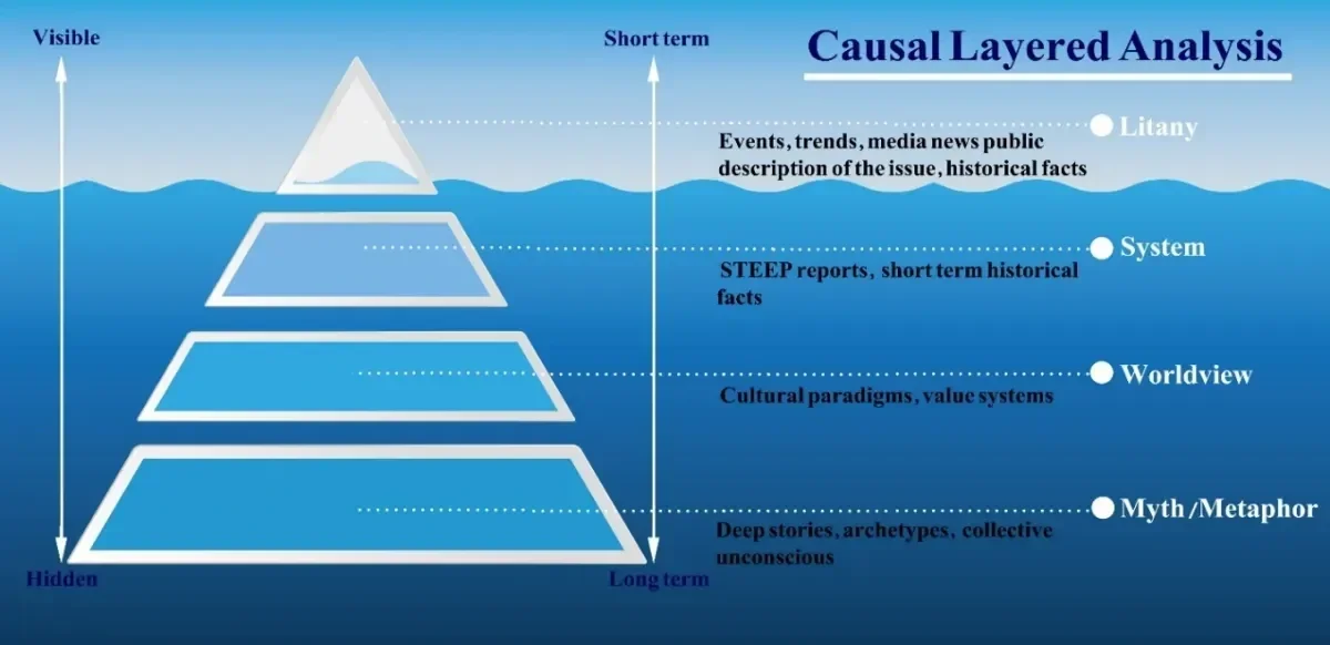 Causal Layered Analysis (CLA) is a method for exploring complex issues by looking beneath the surface to uncover the deeper stories and assumptions that shape them. It works with four layers: